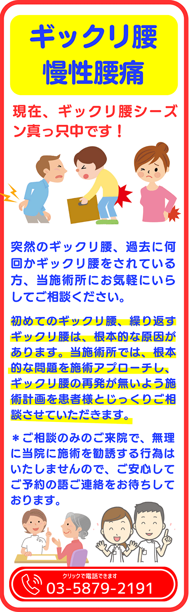 一之江ひだまり整骨院では、段階施術を行っております。ご来院頂く全ての患者様は同じ人間であっても、同じ傷病名であっても、同じ施術を施しても治癒には個人差が発生します。ですから、当院では患者様毎に施術方法が異なります。傷病の重度・中度・軽度や、痛みの程度だけで判断するのではなく、患者様一人一人の体質、精神面、生活環境を十分に把握し、常に患者様からの情報や患部の状態を観察しながら、ステップⅠ、Ⅱ、Ⅲと施術をさせて頂きます。また、当院では「整骨院・接骨院は医療の総合窓口」と意識しております。 内臓疲労や内臓の疾病が原因で、背中・腰の筋肉の緊張が起こり背中、腰の痛み、違和感、ひどい場合にはギックリ腰を起こすケースもございます。そのように発症の原因が内臓の疾病と判断されるような場合もございます。その際は直ちに専門医療機関へ紹介状をご用意させて頂いております。 「私の症状の場合はどうなんだろう・・・」とお悩みにならず、お気軽にご相談下さい。